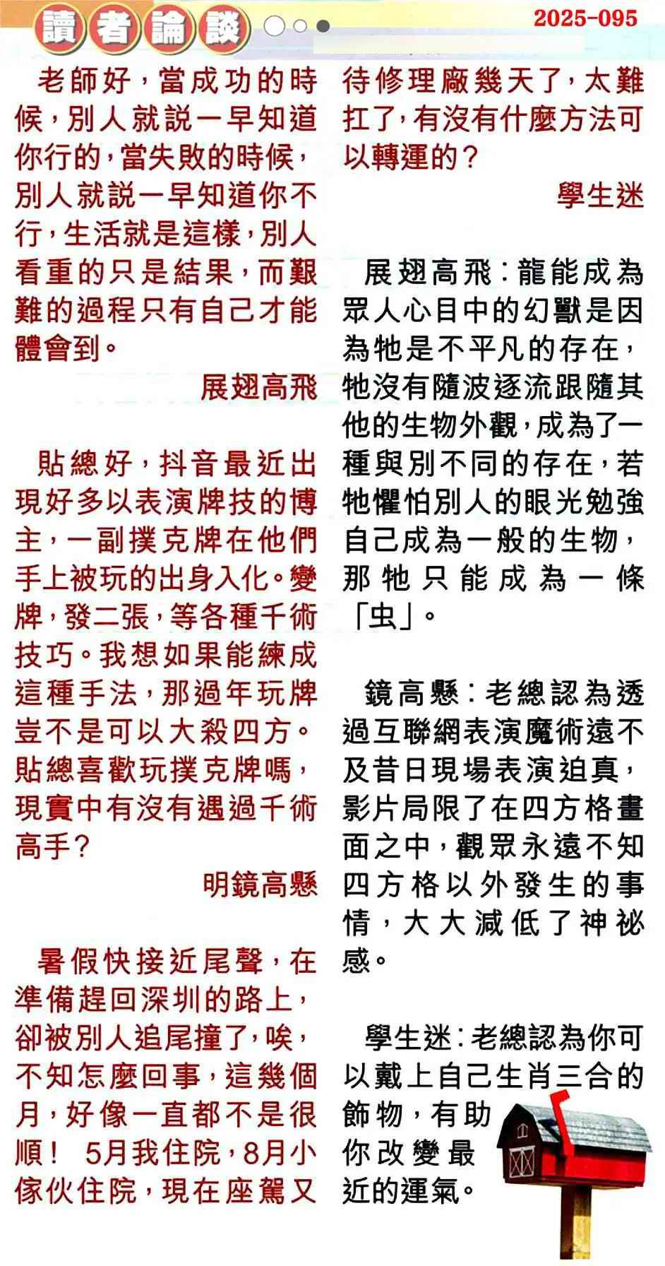 | 主题 :095期:彩民推荐贴信读者论坛 |