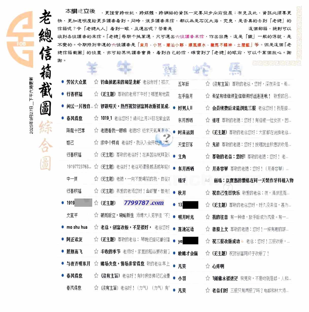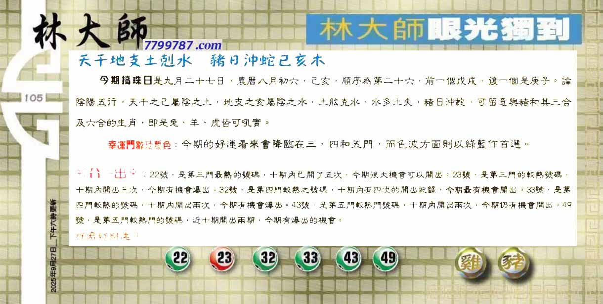 主题 :105期:六合皇金句/老总论码/萧公子/林大师/五行夺码/老总信箱截 |
