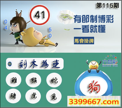 115期正版彩图挂:41 爆:狗 挂牌成语:刻木为吏 挂牌出肖:鸡猴蛇猪虎兔