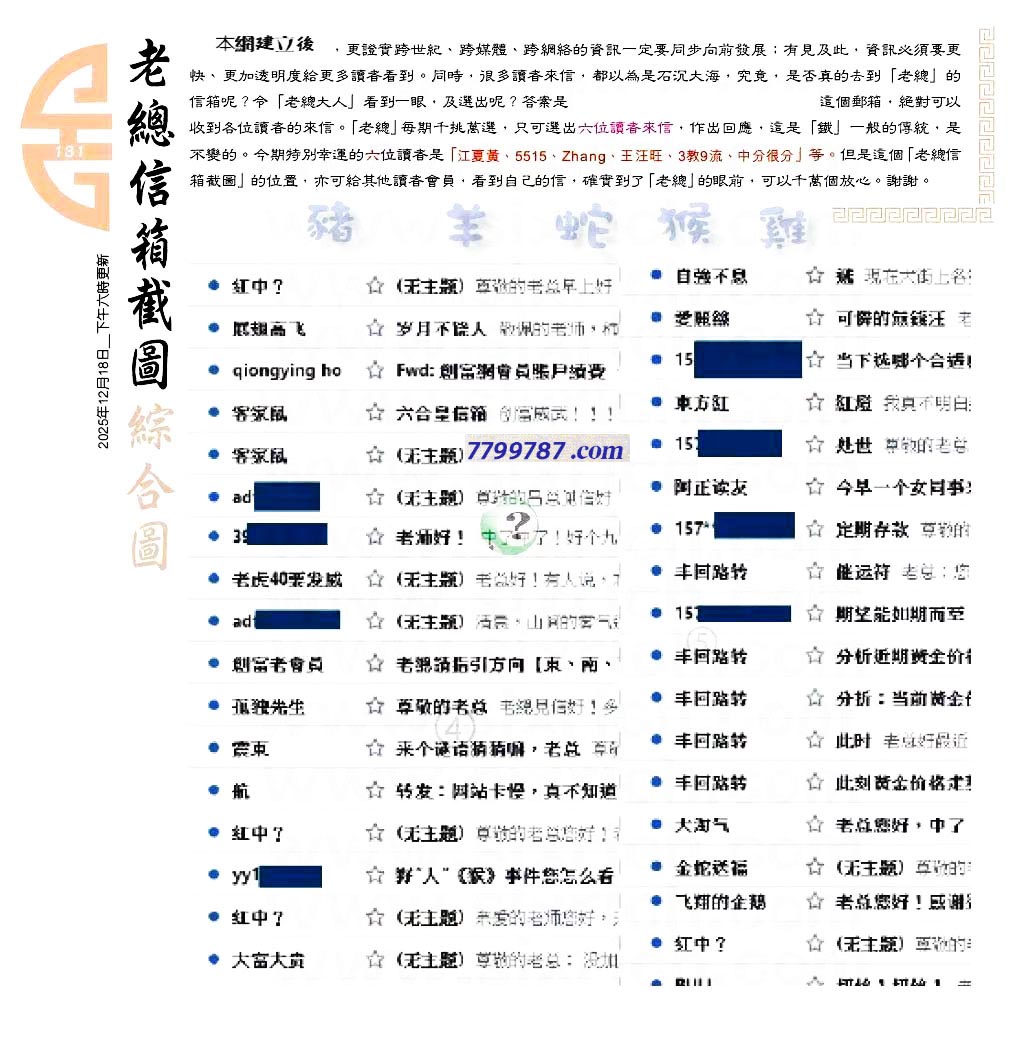 | 主题 :131期:六合皇金句/老总论码/萧公子/林大师/五行夺码/老总信箱截 |