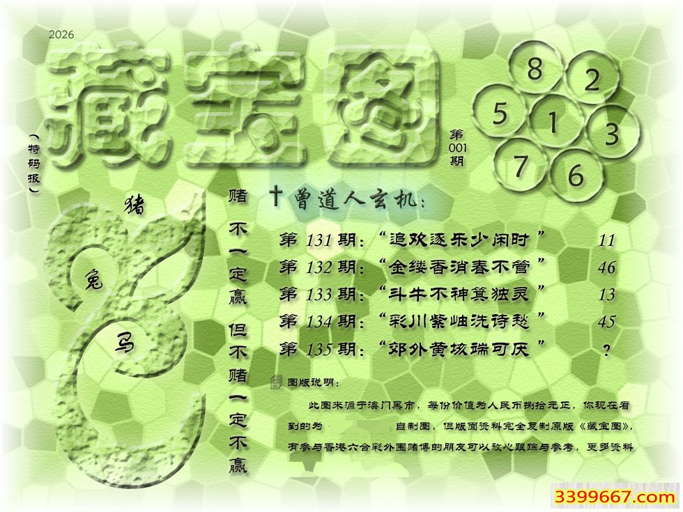 | 主题 :001期藏寶圖 新:郊外黄垓端可厌 老:晴街春色香车立 禁:虎 禁:0尾 |
